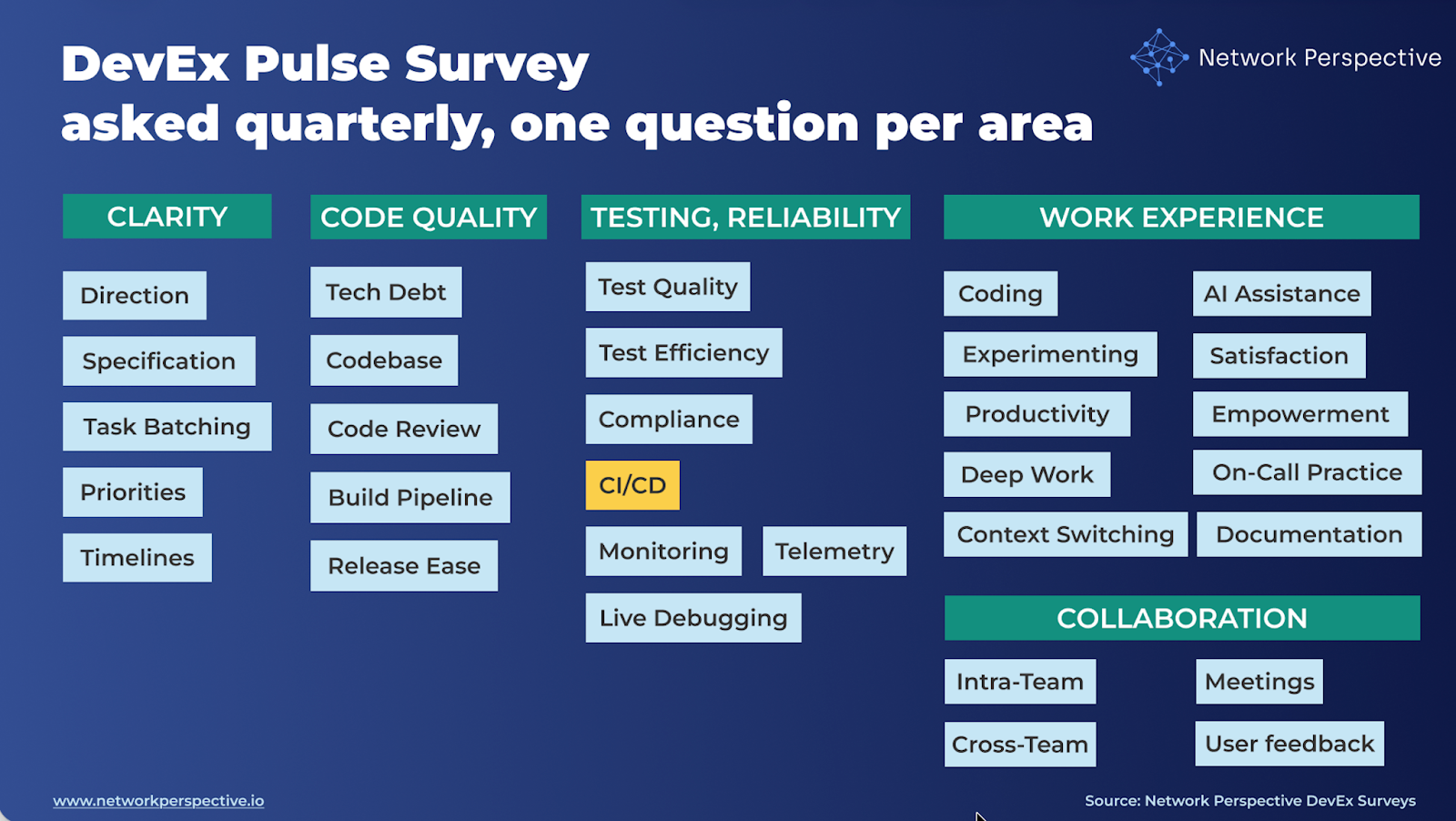 In our DevEx AI tool, we use two sets of survey questions: DevEx Pulse (one question per area to track overall delivery performance) and DevEx Deep Dive (a focused root-cause diagnostic when something needs attention).